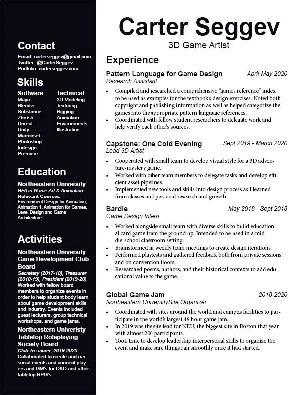 I recently finished my final year at Northeastern University where I earned a BFA in Game Art and Animation. While there I was the President of the Game Dev Club, a student organization aimed at giving students the opportunity develop their skills as well as their professional connections while also providing a community space for our burgeoning devs.